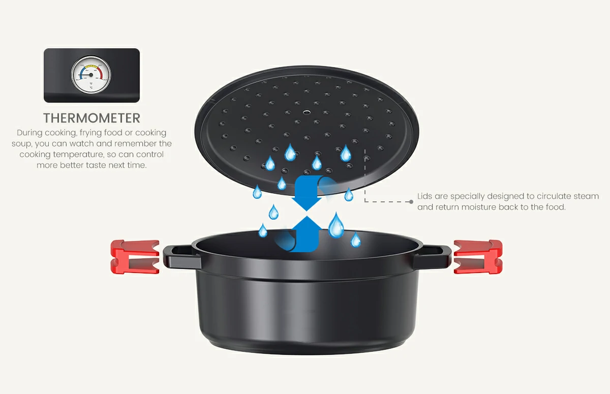 Product Overview of Red Dot induction Nonstick 6-Piece Cookware Set: Our high-performance red dot cooking pan cookware set feature durable solid cast aluminum ensure consistent, even heat distribution and retention for superior energy efficiency.The cast aluminum lid is specially designed to spread condensation evenlythroughout the dish keeping food moist and consistent throughout. Thermometer of cooking pans with red dot shows temperature for cooking control.Great for all heat surfaces, including induction. Oven safe.